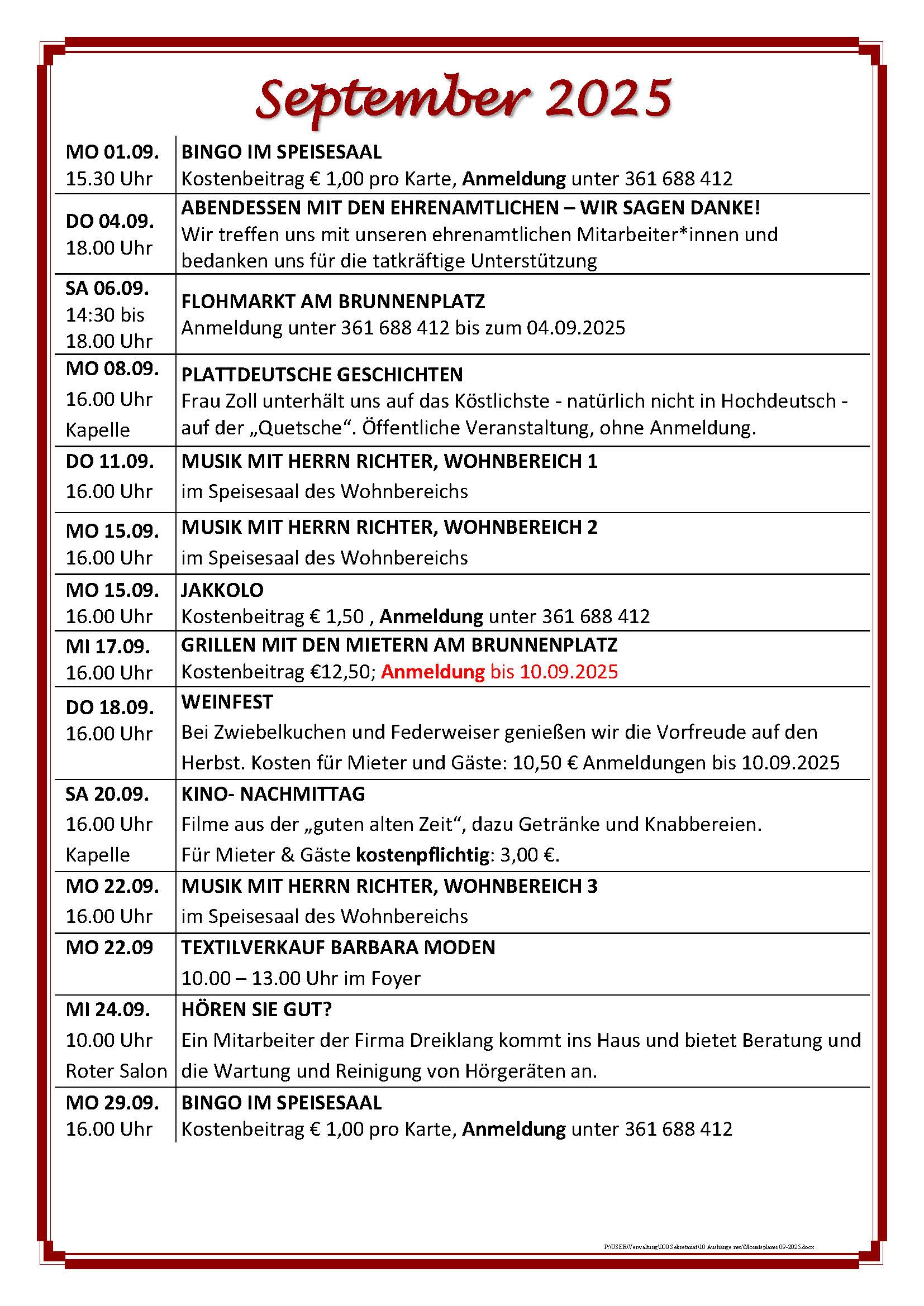 AUGUST TERMINE FÜR DIE BEWOHNER