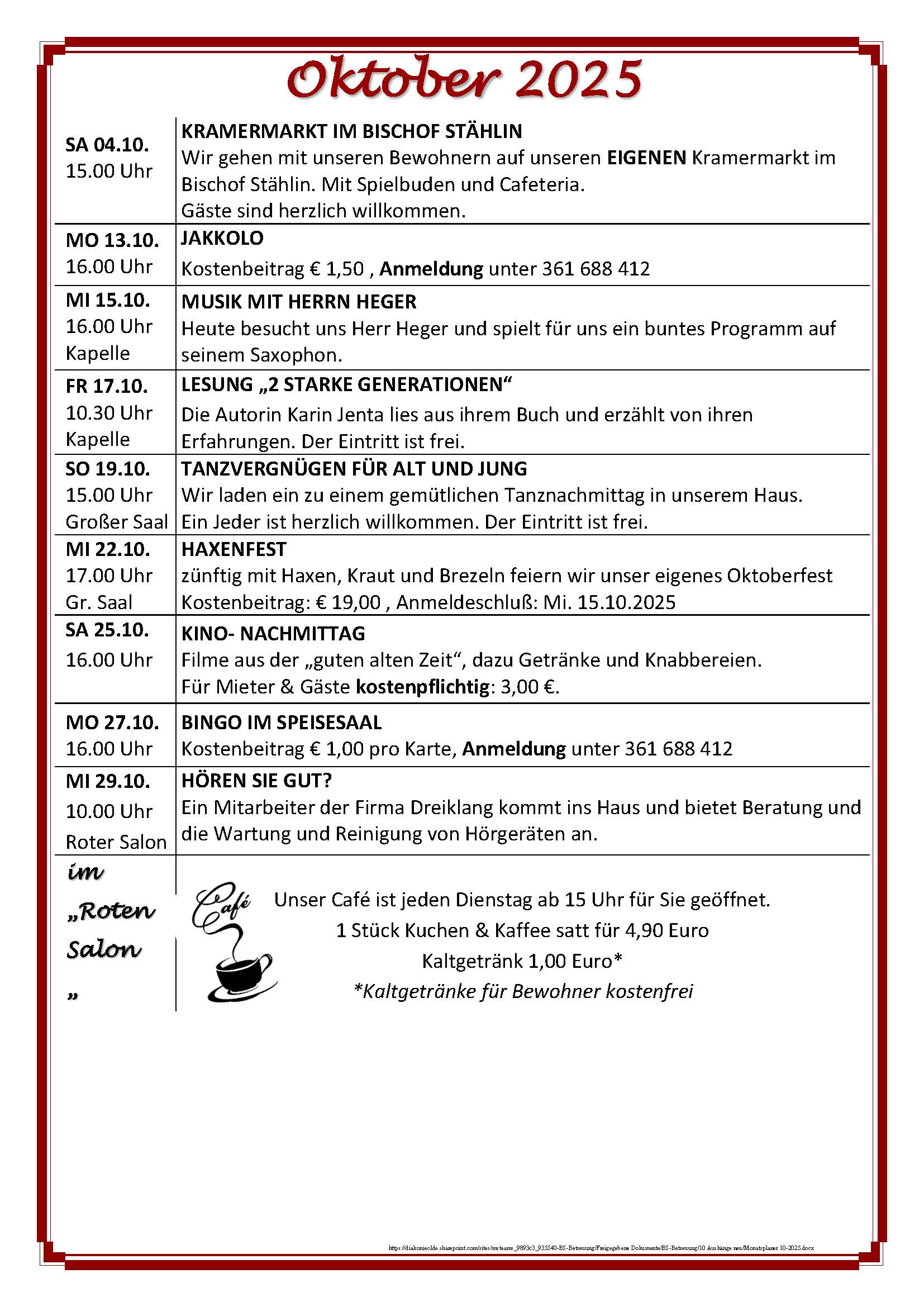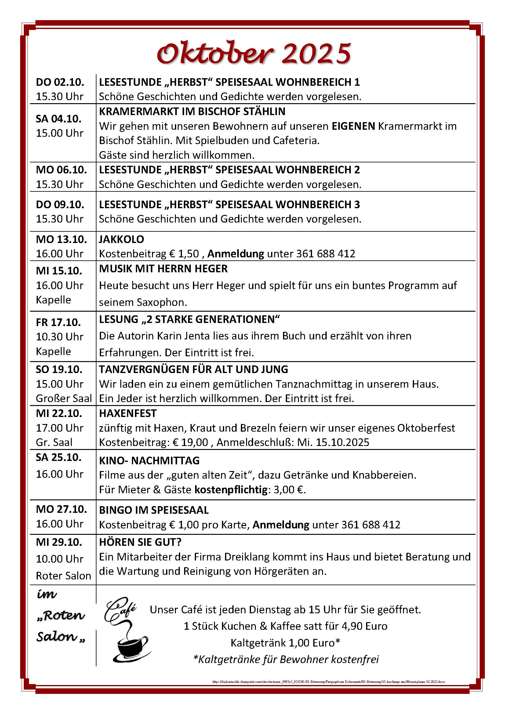 OKTOBER TERMINE FÜR DIE BEWOHNER